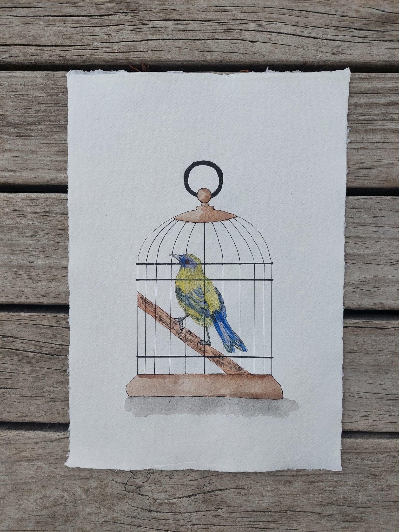 Watercolour and inkpen on A4 150gsm Khadi handmade 100% cotton rag acid-free paper.